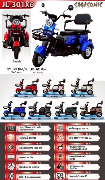 อีเมลล์: jody108@gmail.comสามล้อไฟฟ้า ปรับได้ 1-2-3 ที่นั่ง รุ่นใหม่ ปี2026 Sagasonic JL-301X6