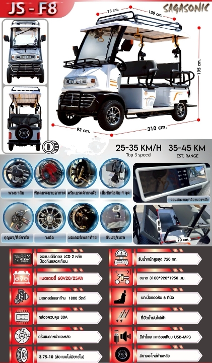 รถกอล์ฟไฟฟ้าขนาดใหญ่ 6 ที่นั่ง 1800 วัตต์ รุ่นล่ามาใหม่ ปี2026 ใช้งานอเนกประสงค์ Sagasonic F8